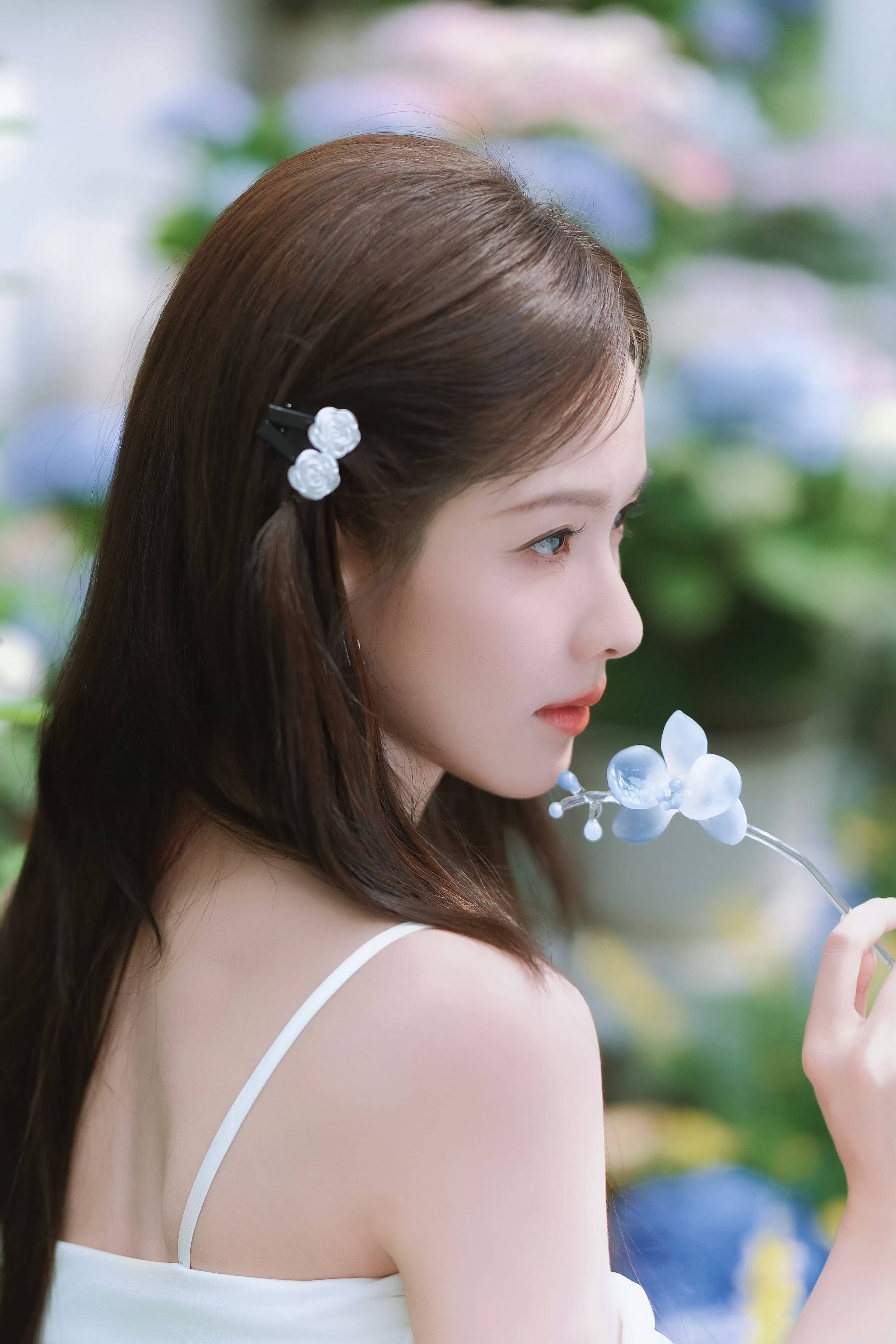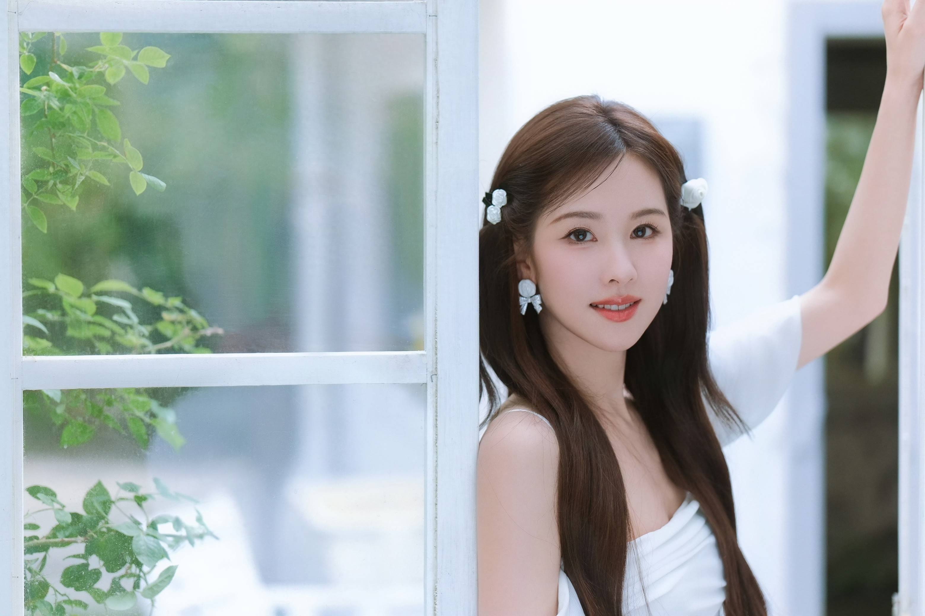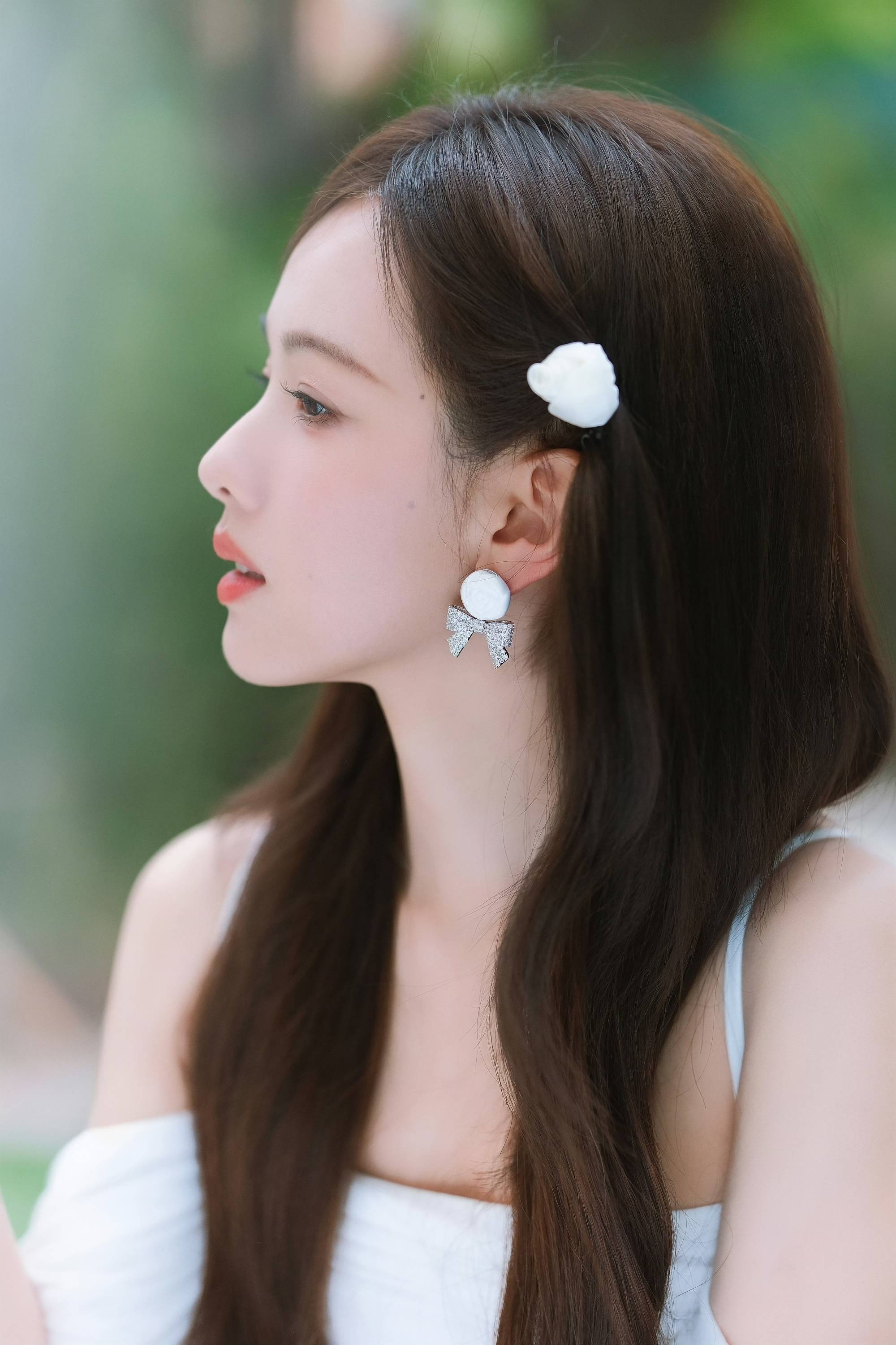 白色露肩层叠裙装于花簇间轻曳,立体褶边与单肩设计将“少女甜感”和“法式浪漫”温柔交织,每一处花瓣配饰的点缀都是风格的韵脚。